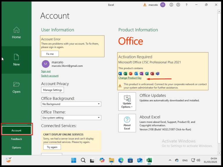 Once installation is complete, open any Microsoft Office application. Go to Account in the bottom-left corner and click Change Product Key on the right below the Office icons.